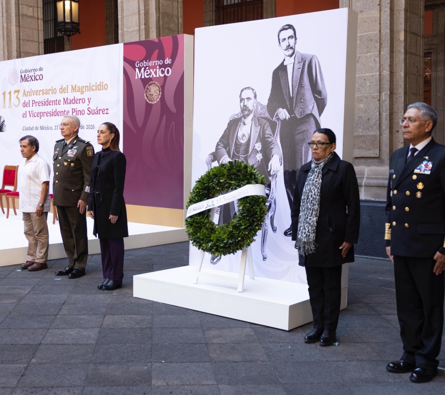 Claudia Sheinbaum encabezó en Palacio Nacional la ceremonia por el 113 aniversario del magnicidio de Francisco I. Madero y José María Pino Suárez. El INEHRM resaltó su papel en el primer gobierno democrático del siglo XX en México. Continúa leyendo Sheinbaum recuerda el magnicidio de Madero y Pino Suárez