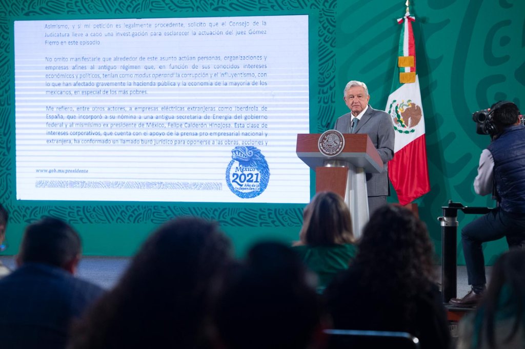 El presidente Andrés Manuel López Obrador hizo un llamado a la Suprema Corte de Justicia de la Nación (SCJN) y al Consejo de la Judicatura Federal para revisar la competencia del juez Juan Pablo Gómez Fierro al conceder la suspensión de la reforma a la Ley de la Industria Eléctrica a un día de haber sido publicada en el Diario Oficial de la Federación.