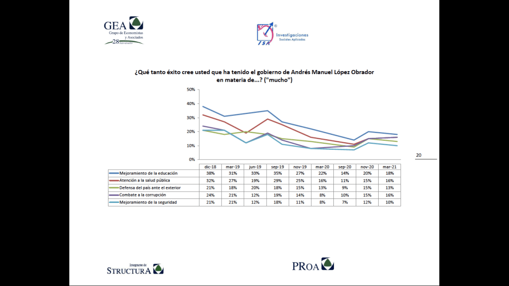 La aprobación sobre la gestión del presidente Andrés Manuel López Obrador se ubicó en 50 por ciento, así lo dio a conocer la empresa encuestadora GEA (Grupo de Economistas y Asociados) e ISA (Investigaciones Sociales Aplicadas) titulado México: Política, Sociedad y Cambio.