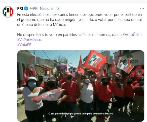 Por ello, este instituto político, encabezado por Alejandro Moreno y Carolina Viggiano, invitó a no desperdiciar el sufragio en partidos satélites de los morenistas y mejor dar un voto útil al PRI y la coalición “Va por México”, conformada también por los partidos Acción Nacional (PAN) y de la Revolución Democrática (PRD), quienes se unieron para defender a México de la destrucción generada por Morena.