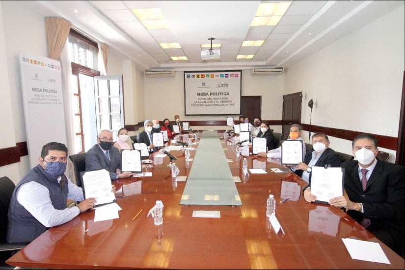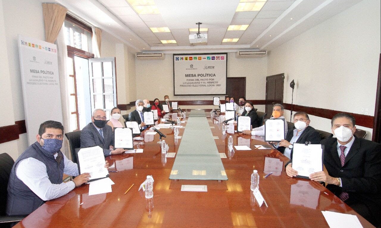 Durante la cuarta sesión de la Mesa Política, realizada por los dirigentes de los once partidos políticos que participan en el proceso electoral local 2021, firmaron el Pacto por la Legalidad y el Respeto.