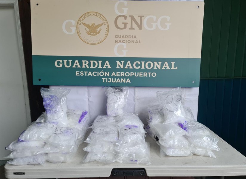 Como resultado de los trabajos de seguridad, inspección y vigilancia que realiza la Guardia Nacional en empresas de mensajería y paquetería ubicadas en el municipio de Tijuana, Baja California, fueron asegurados aproximadamente 112 kilos 65 gramos de aparente metanfetamina dentro de cinco cajas de seguridad metálicas.