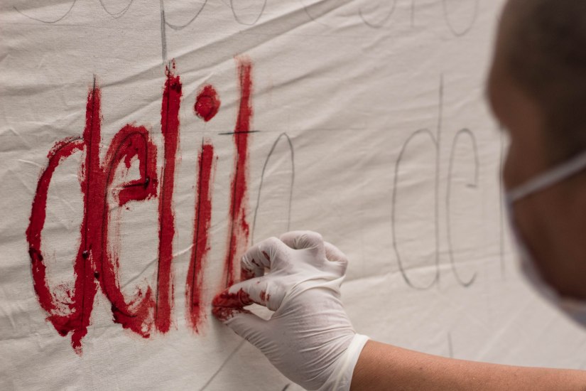 Son decenas las personas dispuestas a extraerse la sangre para convertirla en la tinta carmesí con la que tiñen la enorme tela de manta en la que han escrito la décima segunda fracción del cuarto artículo de la legislación que les brinda esperanza para la liberación de sus seres queridos.