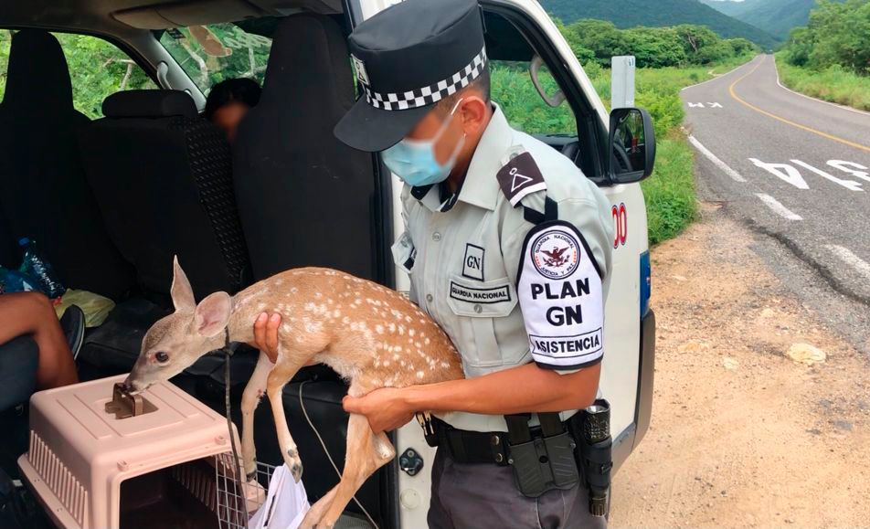 Un cervatillo de venado cola blanca trasladado en una caja transportadora en condiciones de hacinamiento, fue localizado por elementos de la Guardia Nacional cuando realizaban patrullajes de seguridad en carreteras del municipio de San Pedro Huamelula, Oaxaca.