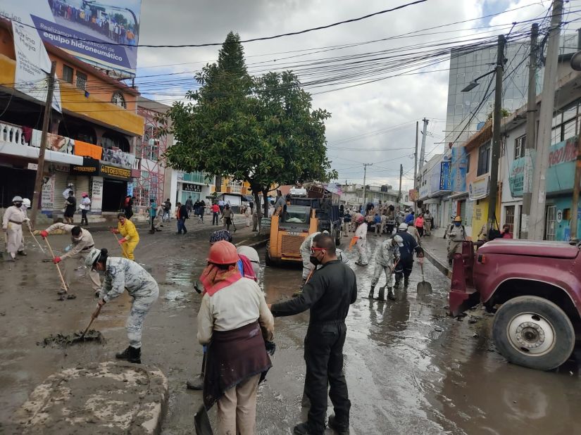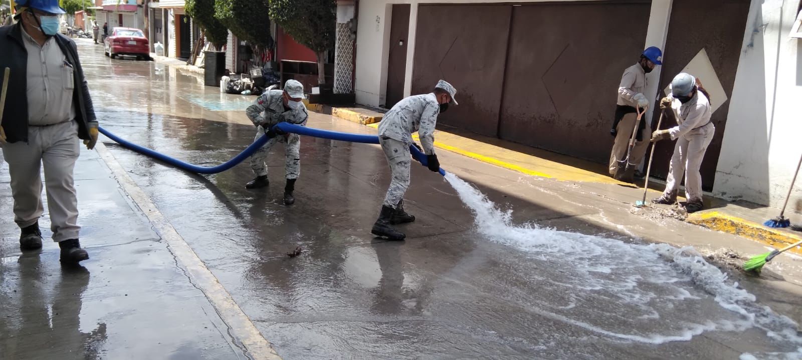 Con apoyo de palas, carretillas y camiones de servicios públicos municipales, la Guardia Nacional auxilia a la población para el retiro de lodo y residuos, así como el lavado de la vía pública, locales comerciales y domicilios particulares.