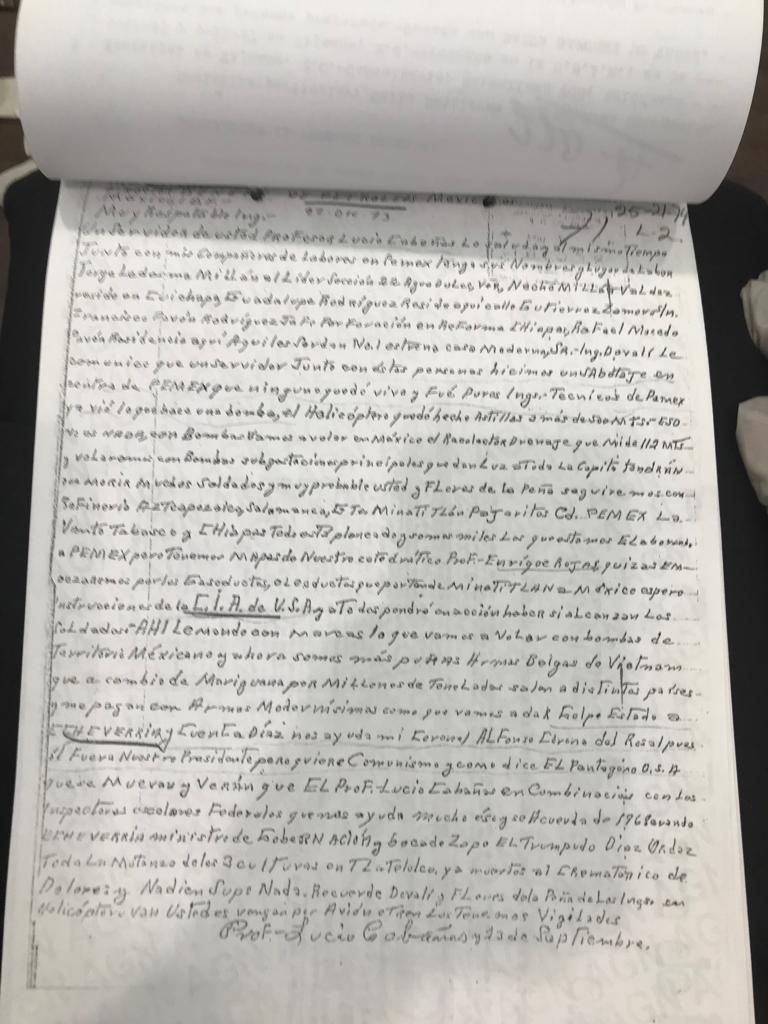 “Y fueron puros ingenieros técnicos de Pemex (…) seguiremos con la refinería de Azcapotzalco, Salamanca, Guanajuato; Minatitlán, Pajaritos, ciudad; La Venta, Tabasco y Chiapas”, afirmó el guerrillero al funcionario federal en el documento.