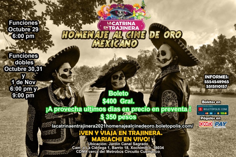 Con un homenaje al Cine de Oro mexicano, la empresa productora Amotlamini presentará del 29 de octubre al 1 de noviembre próximos la octava temporada de La Catrina en Trajinera, Leyendas de Calaveras Garbanceras de Sergio Laurel, con personajes icono del cine nacional como Dolores del Río, Pedro Infante, Jorge Negrete, María Félix, Blanca Estela Pavón, Sara García, Lola Beltrán, Frida Kahlo, Diego Rivera y Chabela Vargas.