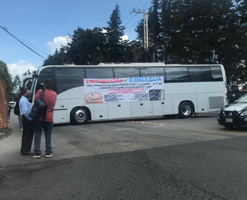 A través de un autobús de pasajeros, los manifestantes colgaron una manta donde se lee «Corrupción en Conagua. Carlos Jesús García Fernández Galicia, corrupto e inepto, tolera el huachicol con el agua».