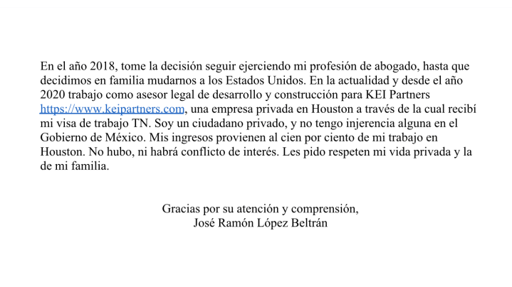 «Soy un ciudadano privado, y no tengo injerencia alguna en el gobierno de México. Mis ingresos provienen al cien por ciento de mi trabajo en Houston. No hubo, ni habrá conflicto de interés. Les pido respeten mi vida privada y la de mi familia», añadió en su mensaje.