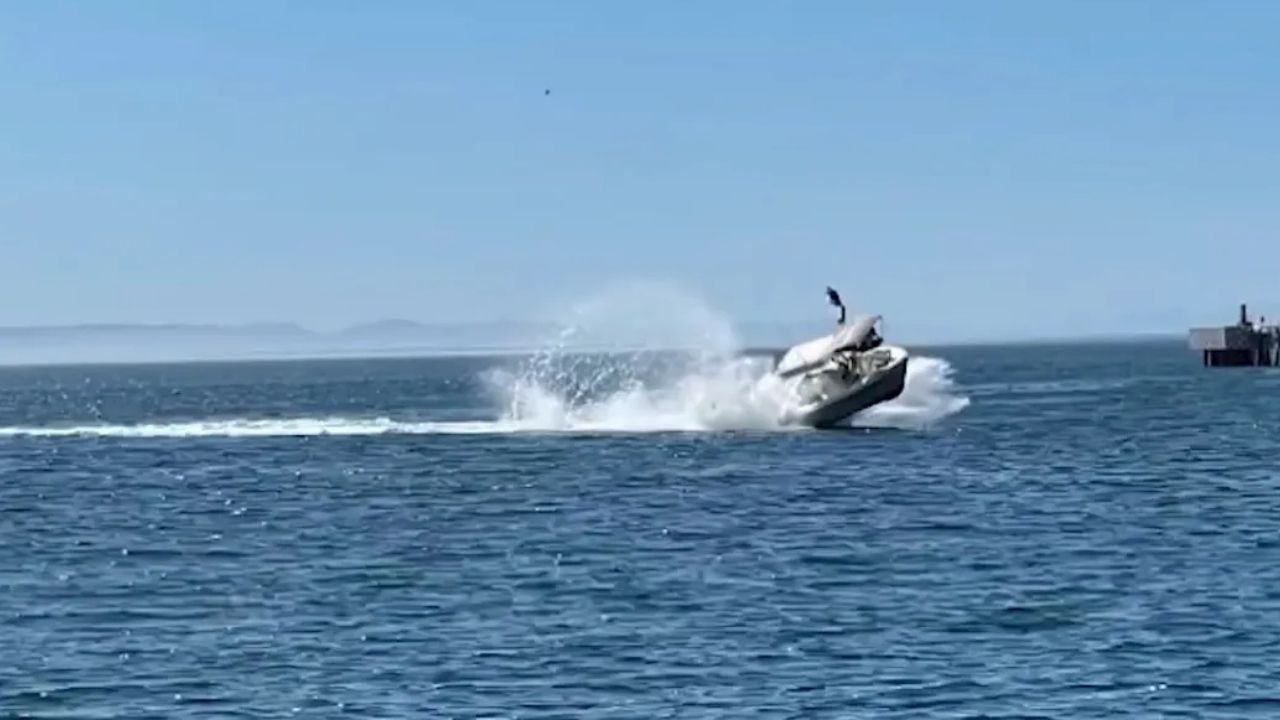 Protección Civil dio a conocer un video donde se muestra que la embarcación golpeó algo en aguas abiertas, por lo que se inclina con la fuerza suficiente para arrojar a un pasajero a través del toldo.