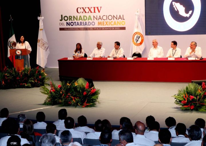 El magistrado Priego Oropeza dio comienzo a los trabajos desarrollados en el teatro Esperanza Iris, ante la deferencia del secretario de Gobernación (Segob), Adán Augusto López Hernández, quien acudió a Tabasco con la presidente del Senado, Olga Sánchez Cordero Dávila, para acompañar a sus compañeros notarios encabezados por Guillermo Escamilla Narváez.