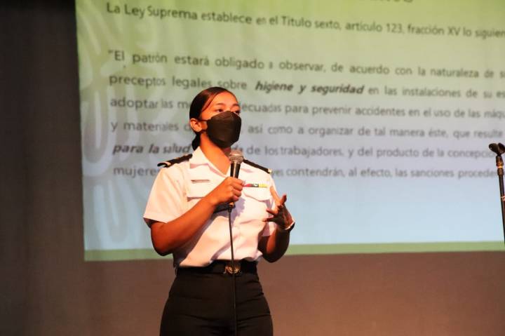 A través del curso “Salud y seguridad en el trabajo”, la teniente Daniela Michelle Sánchez Aguilar, de la Marina, explicó a las y los asistentes las medidas que se deben de seguir para prevenir y asegurar su vida y salud dentro de los espacios laborales.