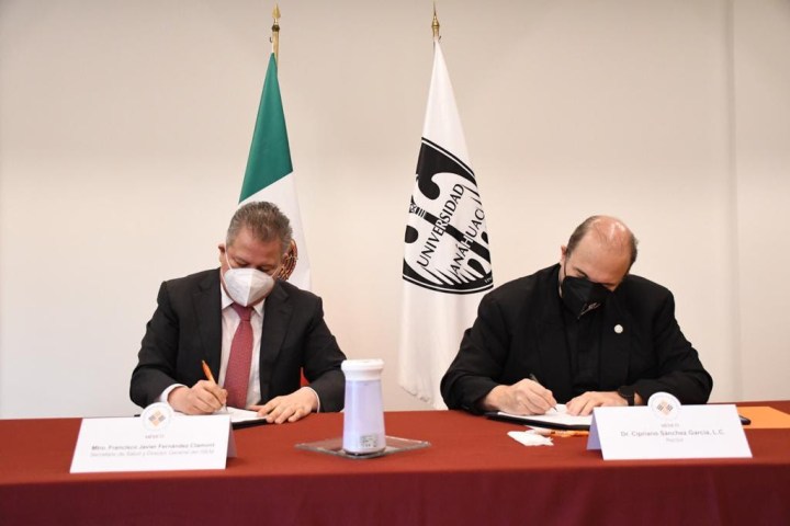 El documento fue suscrito por el secretario de Salud, Francisco Javier Fernández Clamont, y el rector del campus norte de la Universidad Anáhuac, Cipriano Sánchez García, quien fue el anfitrión de este evento.