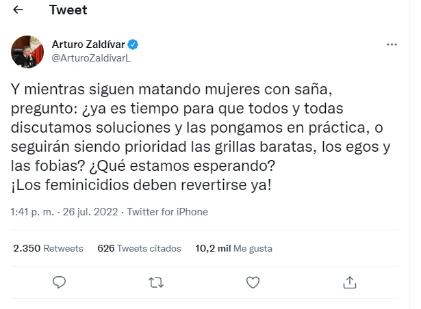 En la red social Zaldívar pidió que “los feminicidios deben revertirse ya”, por lo que Calderón aprovechó el tuit para señalar que era una crítica hacia la administración de López Obrador, por lo que el ministro se desmarcó de los dichos e indicó que “se equivoca de destinatario”.