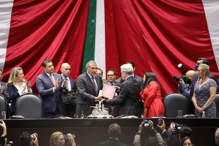 Ya en el estrado del recinto legislativo, el secretario Adán Augusto López Hernández entregó por escrito al Congreso de la Unión, del Cuarto Informe sobre el estado que guarda la administración pública del país.