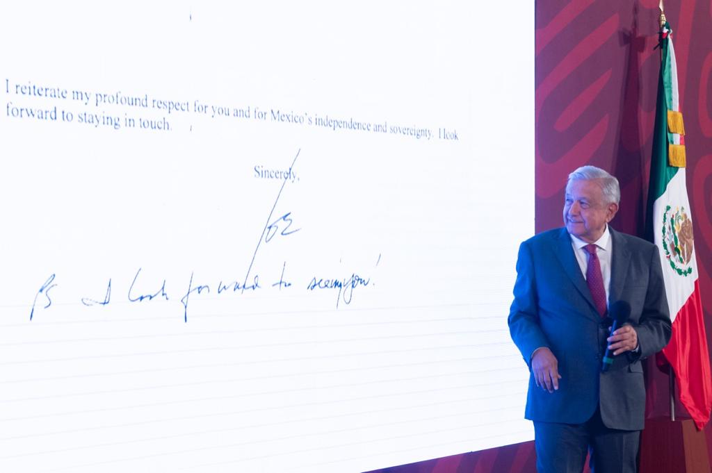 En conferencia de prensa matutina, el mandatario mostró un fragmento de la carta que recibió del presidente de los Estados Unidos, Joseph Biden, fechada el 29 de agosto de 2022.
