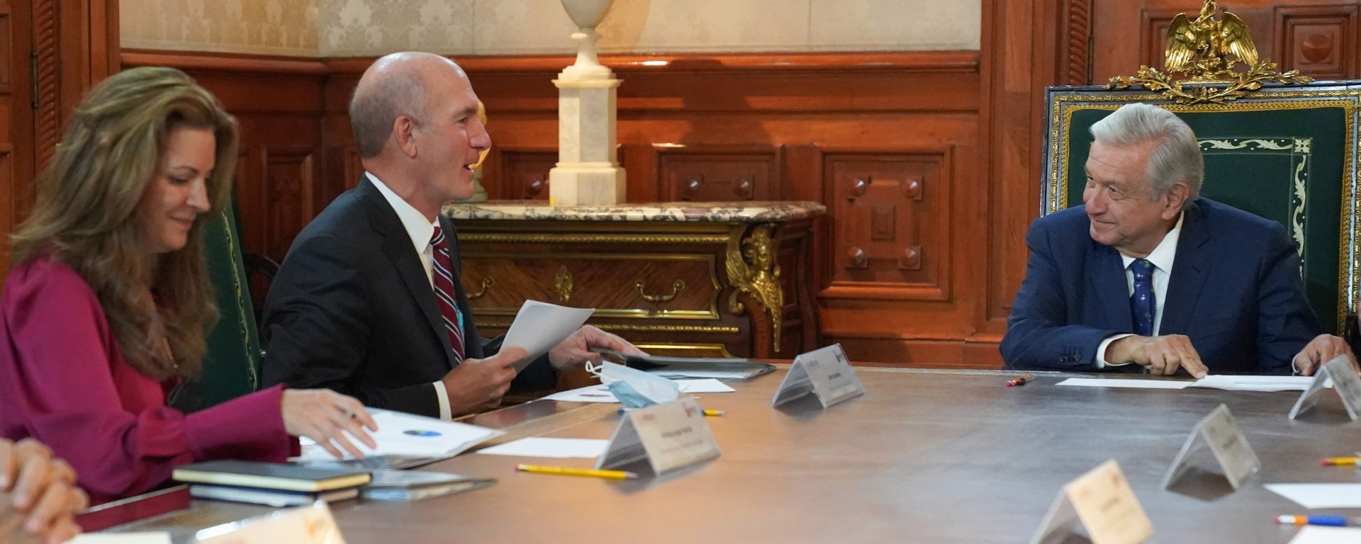 El presidente Andrés Manuel López Obrador sostuvo este jueves una reunión en Palacio Nacional con el director general global de AT&T, John Stankey y la directora general en México, Mónica Aspe Bernal.