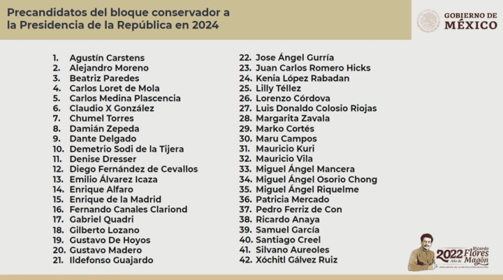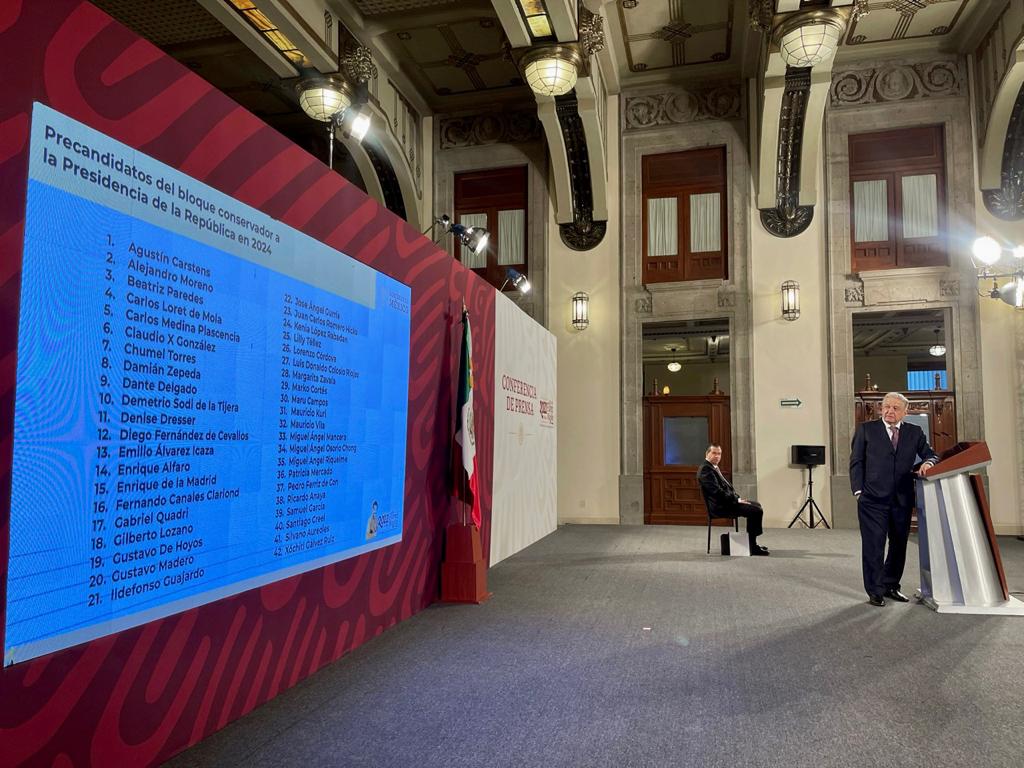 El presidente Andrés Manuel López Obrador dio a conocer una lista de posibles “precandidatos del bloque conservador a la Presidencia”, quienes podrían contender en las elecciones de 2024.