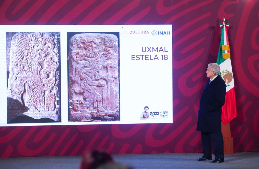 En conferencia de prensa matutina con el presidente Andrés Manuel López Obrador, informó que este relieve fue hallado el fin de semana pasado por el arqueólogo maya José Huchim Herrera y su equipo técnico.