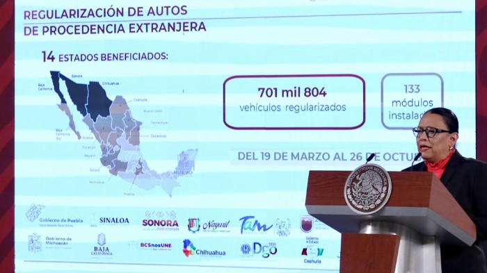 Rosa Icela Rodríguez, titular de la secretaria de Seguridad y Protección Ciudadana, informó que se han 701 mil 804 unidades, modelos 2016 y anteriores, dentro del programa de Regularización de Autos Usados de Procedencia Extranjera.