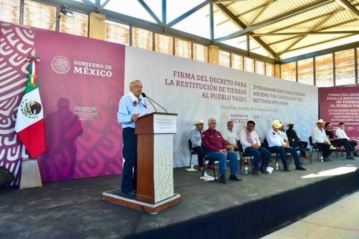 Guaymas, Sonora.- El presidente Andrés Manuel López Obrador firmó el decreto por el cual se restituyen y entregan 29 mil 241 hectáreas de tierra al pueblo yaqui. Esta acción forma parte de los compromisos hechos en el Plan de Justicia firmado en 2021.