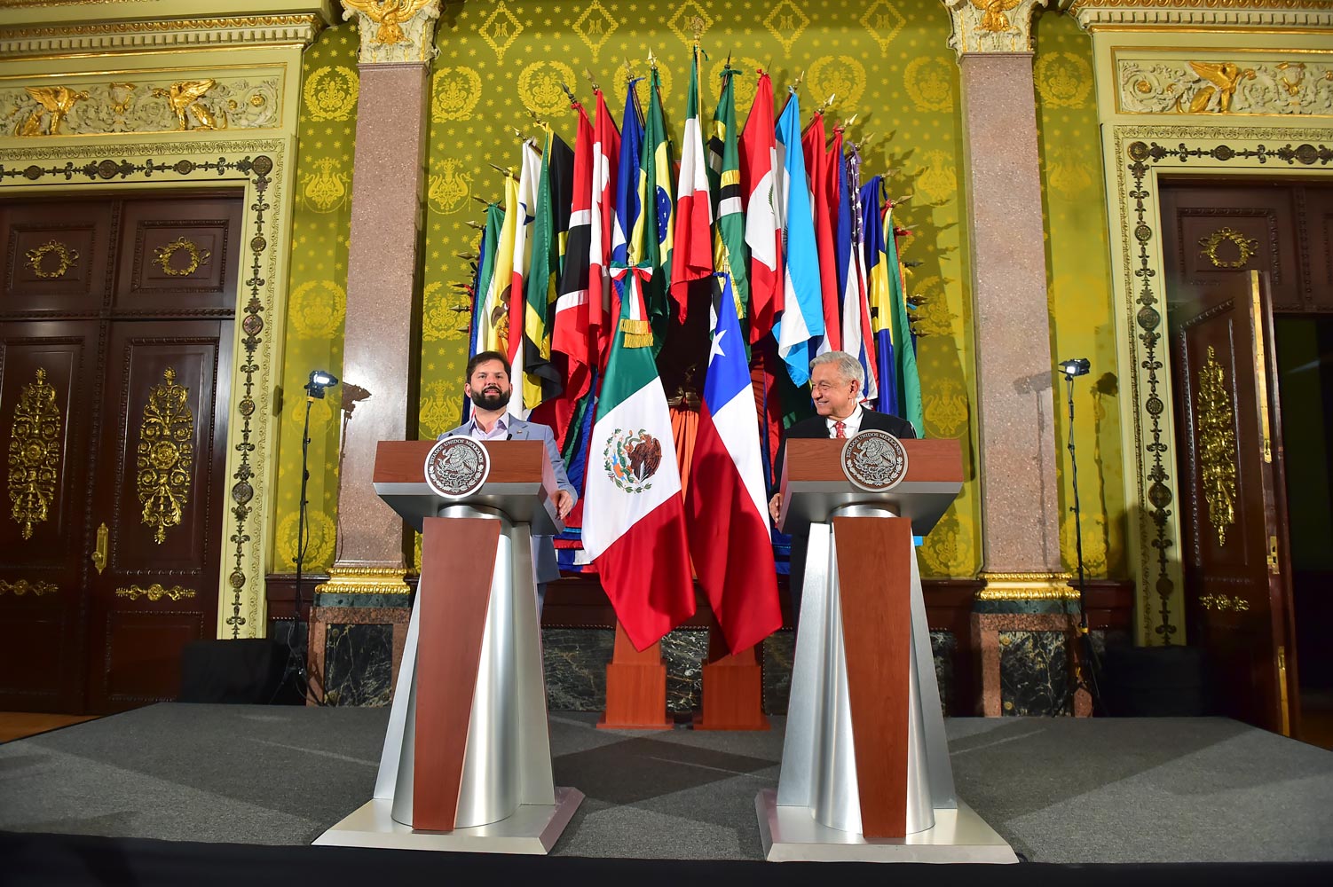 El presidente Andrés Manuel López Obrador ofreció este miércoles una conferencia de prensa con su homólogo chileno, Gabriel Boric Font, tras finalizar la reunión bilateral ampliada que tuvieron esta tarde como parte de su encuentro oficial acompañados de las respectivas comitivas de los gobiernos de México y Chile.