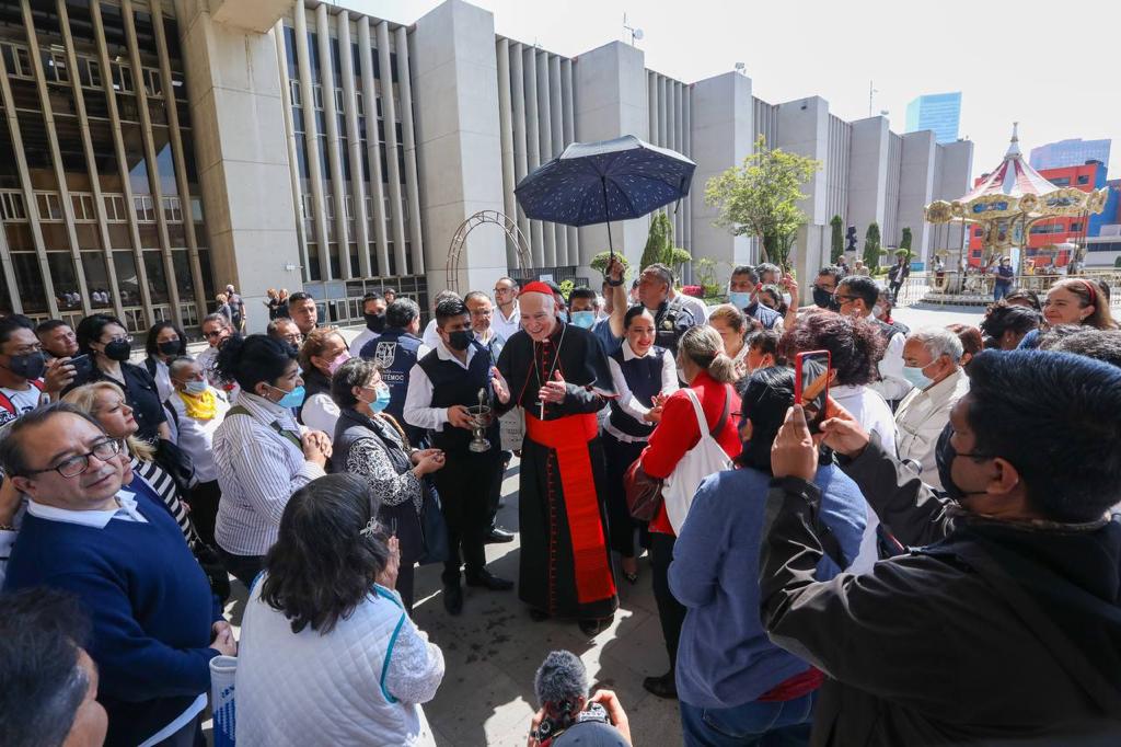 Durante su estancia en las instalaciones de la alcaldía, el cardenal Aguiar Retes recibió muestras de respeto por parte de los trabajadores que lo interceptaron durante su recorrido por las oficinas de las 8 direcciones generales con las que cuenta la institución.