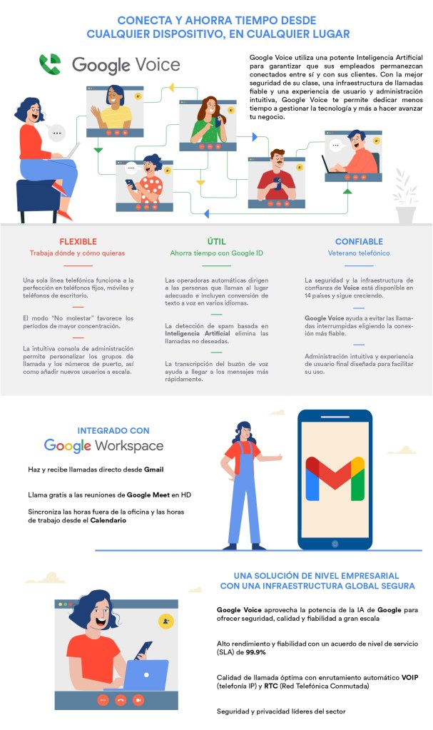 Google Voice es una solución telefónica nativa en la Nube y fácil de administrar, que usa la inteligencia artificial de Google para ofrecer una experiencia de llamada intuitiva que ayuda a las personas a mantenerse conectadas entre sí, con sus clientes y con cualquier persona, a la vez que ahorran tiempo. Con la mejor seguridad de su clase, ya que ofrece una infraestructura de llamadas confiable, lo que permite dedicar menos tiempo a gestionar la tecnología para enfocarse en expandir el negocio.
