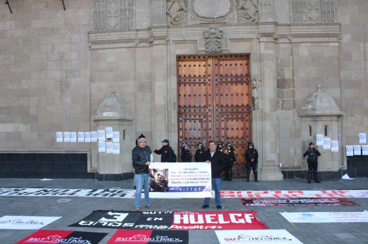 Frente a Palacio Nacional, integrantes del Sindicato Independiente de Trabajadores y Trabajadores de Gobierno del estado (SITTGE) demandaron al Presidente, Andrés Manuel López Obrador su intermediación directa, para que sensibilice al gobernador, Ricardo Gallardo Cardona, a fin de que cese el clima de hostigamiento y represión en su contra, y resuelva sus demandas laborales, durante un evento de apoyo y solidaridad con el Sindicato Único de Trabajadores de Notimex.