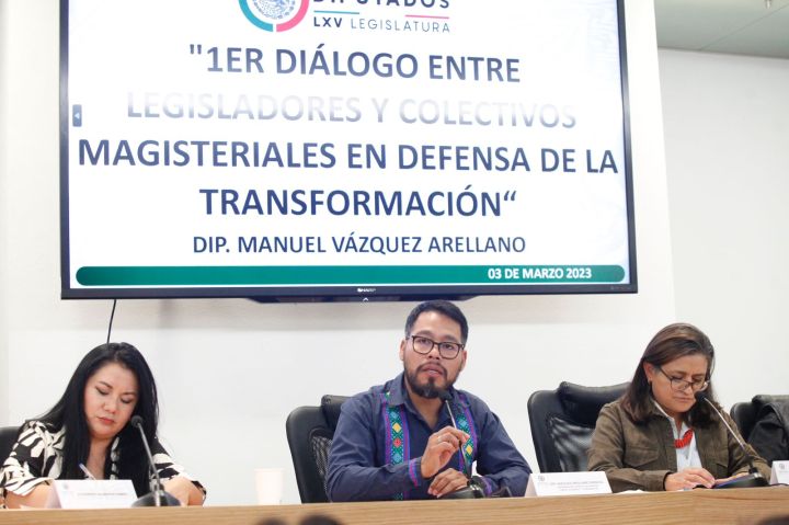 El diputado Manuel Vázquez Arellano (Morena) encabezó el primer encuentro de legisladores con colectivos magisteriales para emprender en conjunto la defensa de la «cuarta trasformación» del país.
