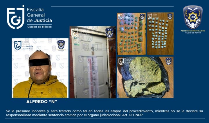 Detectives de la Fiscalía General de Justicia de la Ciudad de México (Fgjcdmx) cumplieron una orden de cateo en una vivienda ubicada en la alcaldía Cuauhtémoc, donde fue posible el aseguramiento de diversas cantidades de posible narcótico, así como la detención de un hombre.