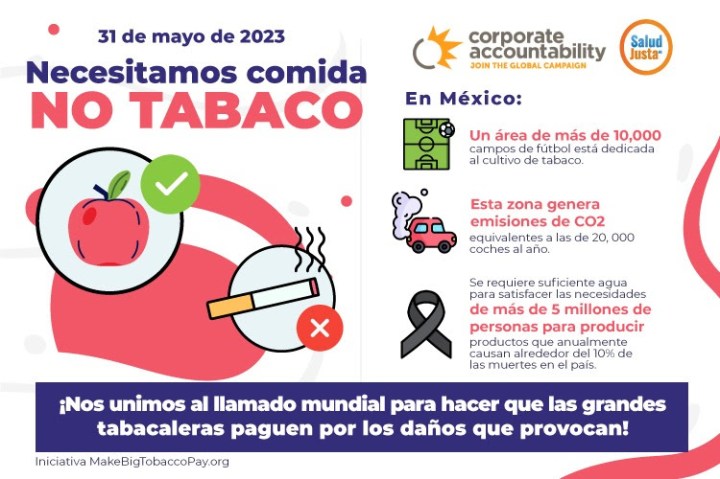 De acuerdo con el tema de este Día Mundial Sin Tabaco, "necesitamos comida, no tabaco", un nuevo análisis de Corporate Accountability examina los costos adicionales de la producción de tabaco. Entre sus hallazgos, el cultivo de tabaco desvía suficiente tierra para alimentar a 40,000 personas en un solo mercado importante para esta industria mortal.