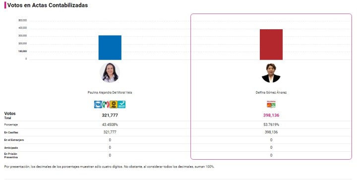 A las 20:15 horas, los resultados mostraban una ventaja significativa para la candidata Delfina Gómez Álvarez, representante de los partidos PVEM, PT y Morena, sobre su contendiente Alejandra Del Moral Vela, quien encabezaba la coalición PAN-PRI-PRD-Panal.