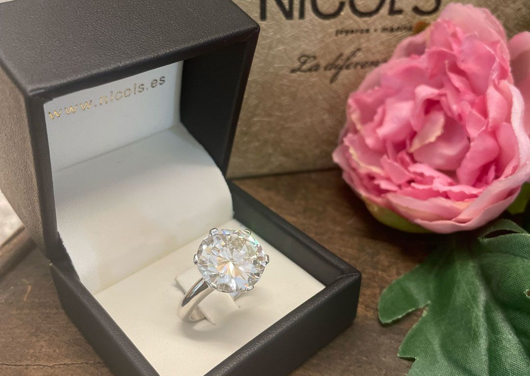 Un anillo estilo solitario de diamante hecho a mano en Madrid para una persona de menos de 30 años, en oro de 18kt, con una corona de seis garras que engastan un monumental diamante de más de 10ct, creado en el fondo de la tierra hace decenas de miles de años, que se ha convertido en testimonio del excepcional talento y la dedicación de la familia Nicols en el arte de la joyería.
