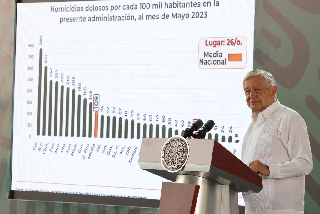 El presidente Andrés Manuel López Obrador constató la tendencia a la baja de diversos delitos que se registró durante mayo en Chiapas.