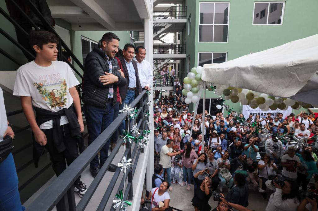 Martí Batres Guadarrama, jefe de gobierno, junto con el coordinador ejecutivo de Seguimiento Institucional del Instituto de Vivienda (Invi), Rodrigo Chávez Contreras, y la representante de la Unidad Habitacional Tetrazzini 88, Judith Barrios Bautista, presidieron la entrega de viviendas en la alcaldía Cuauhtémoc.