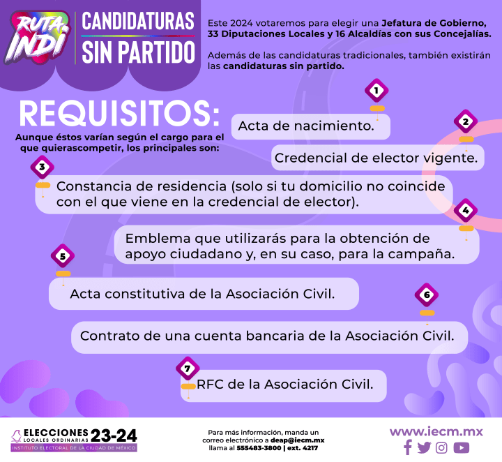 El Instituto Electoral de la Ciudad de México (IECM) puso a disposición de la ciudadanía capitalina el micrositio “Ruta Indi, candidaturas sin partido”, con el fin de dar a conocer los requisitos para competir bajo esta figura ciudadana, en el próximo Proceso Electoral Local Ordinario 2023-2024.