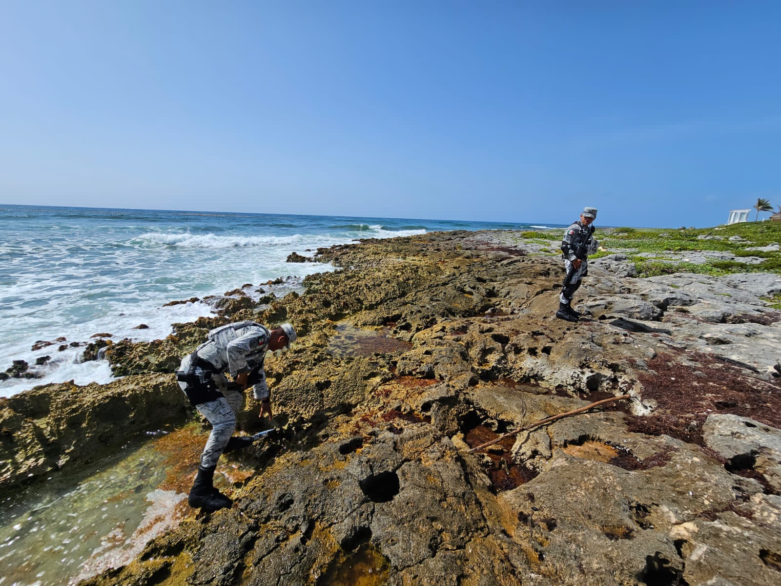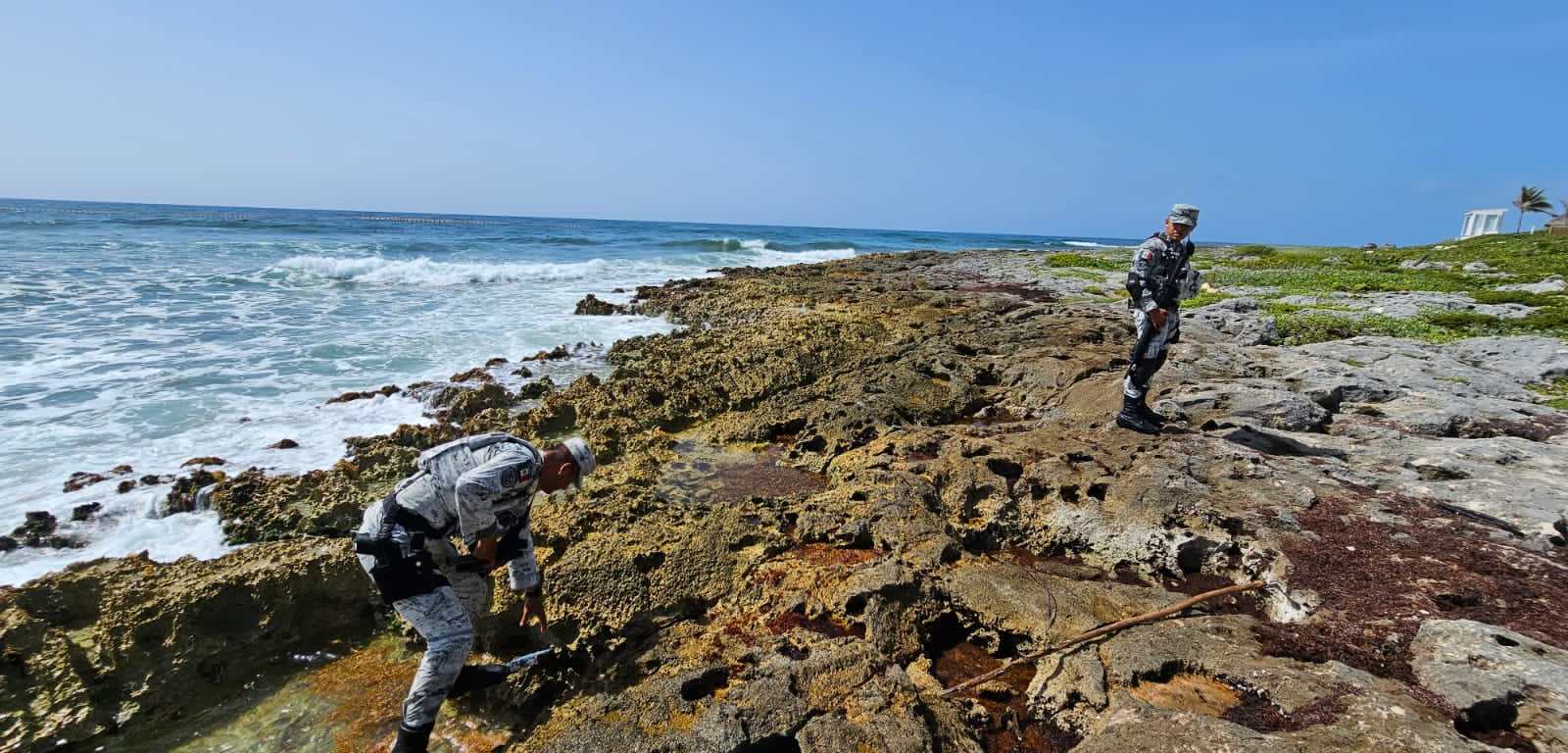 El personal de la Guardia Nacional se percató de que, entre las rocas y el sargazo de la playa había un paquete rectangular, emplayado con cinta transparente.