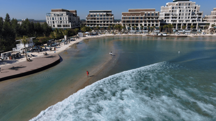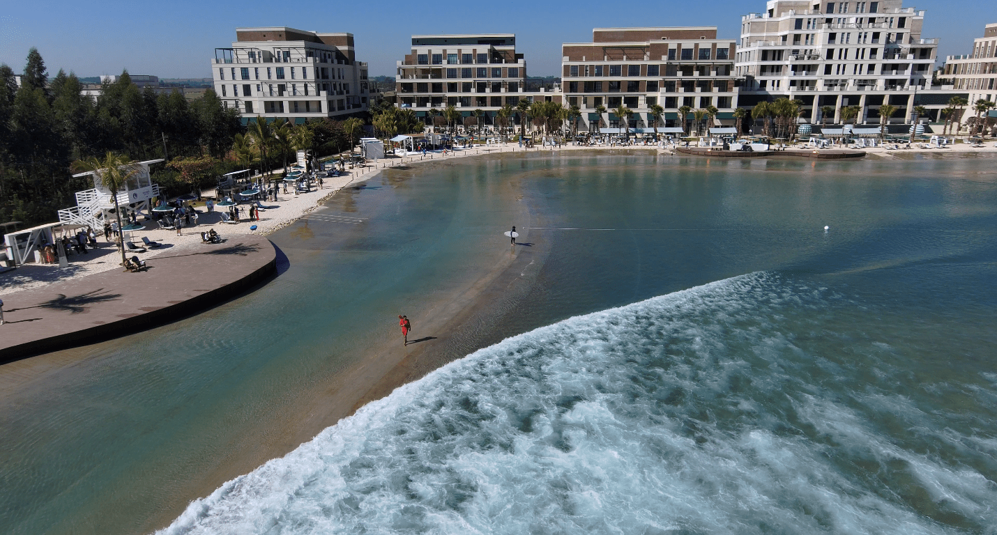 El desarrollo residencial, ubicado a sesenta minutos de São Paulo, sorprendió a invitados y celebridades con una piscina de surf PerfectSwell de seis acres y un entorno de lujo que incluye condominios frente a la playa, spa, tiendas, club y resort de playa.