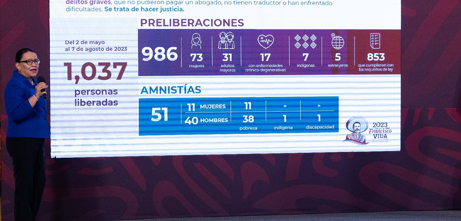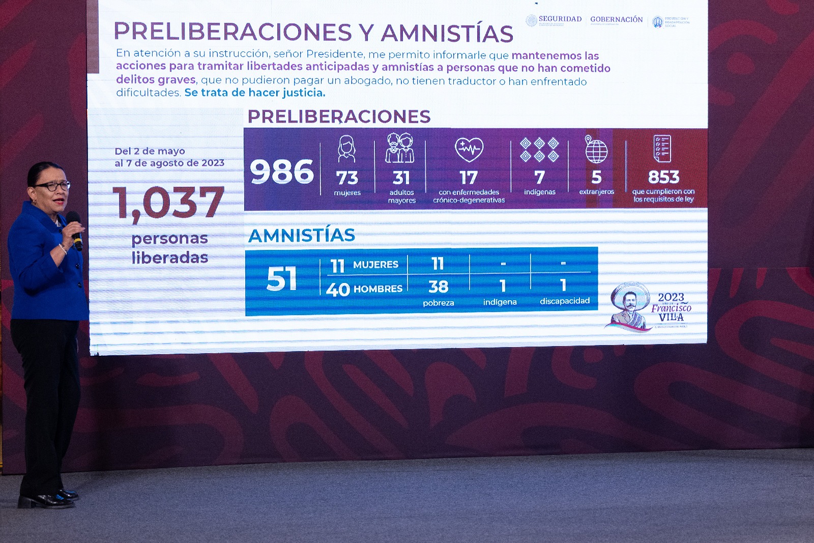 Informó que en total, de julio de 2022 al 7 de agosto de este año, han quedado en libertad 6 mil 837 personas que permanecían en centros penitenciarios, y de éstas, 6 mil 537 lograron la pre-liberación y 300 obtuvieron amnistía.