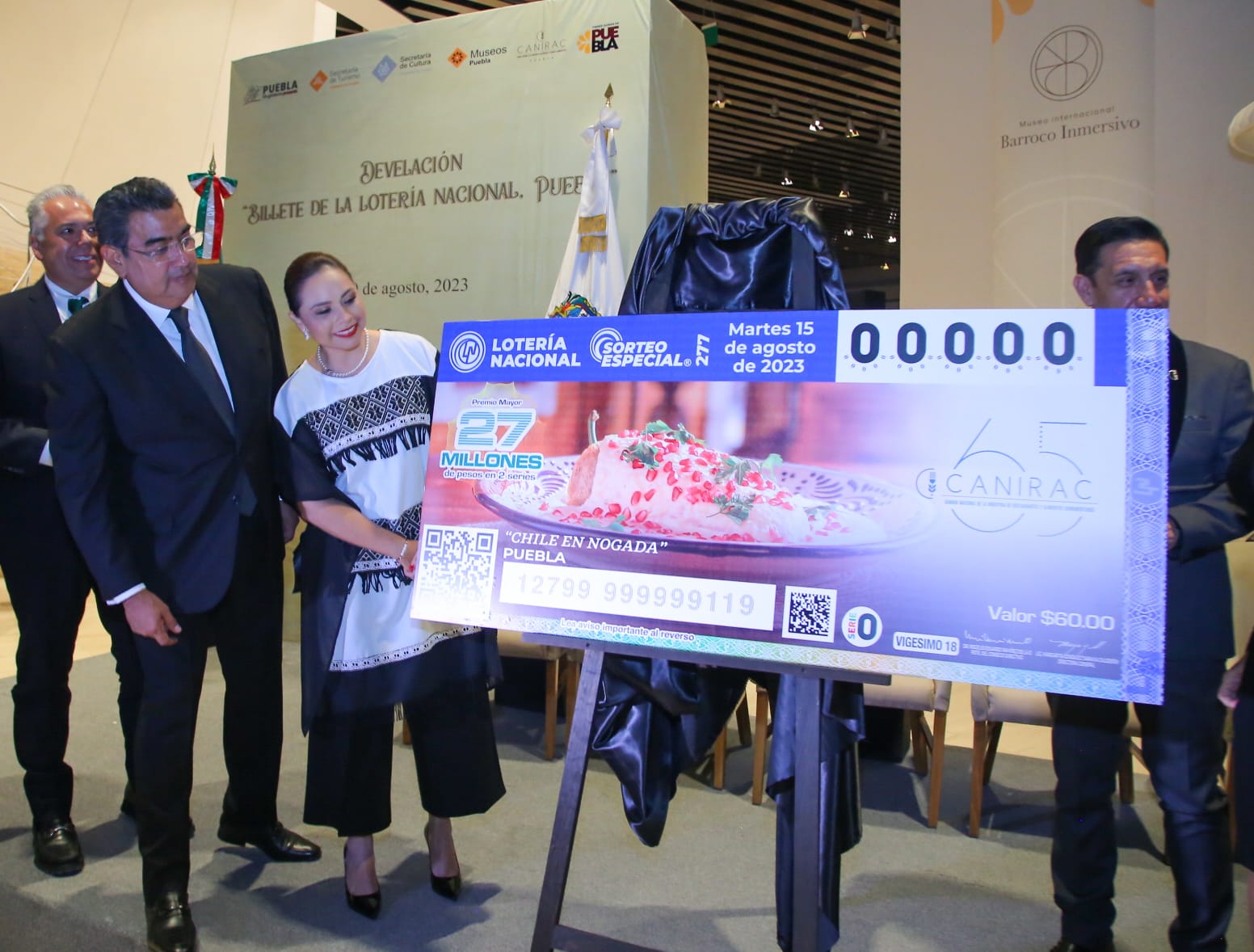 Puebla, Puebla.- El gobernador Sergio Salomón encabezó la develación del «cachito» de la Lotería Nacional con la imagen del emblemático Chile en Nogada en Puebla.