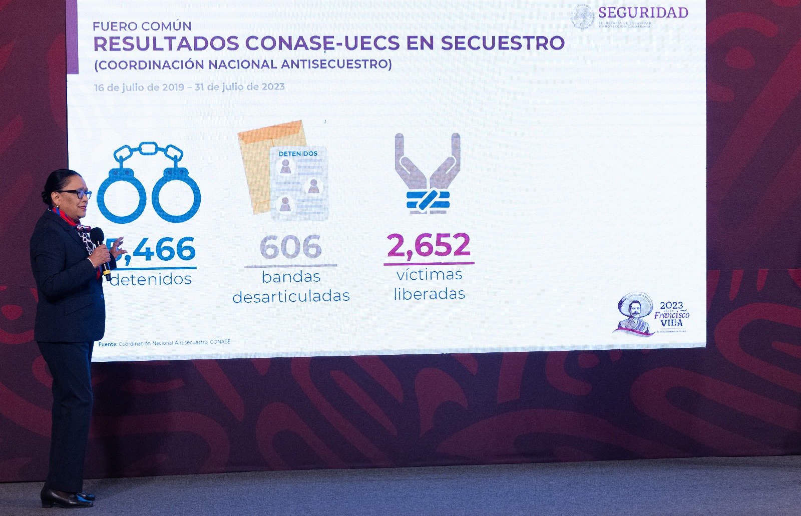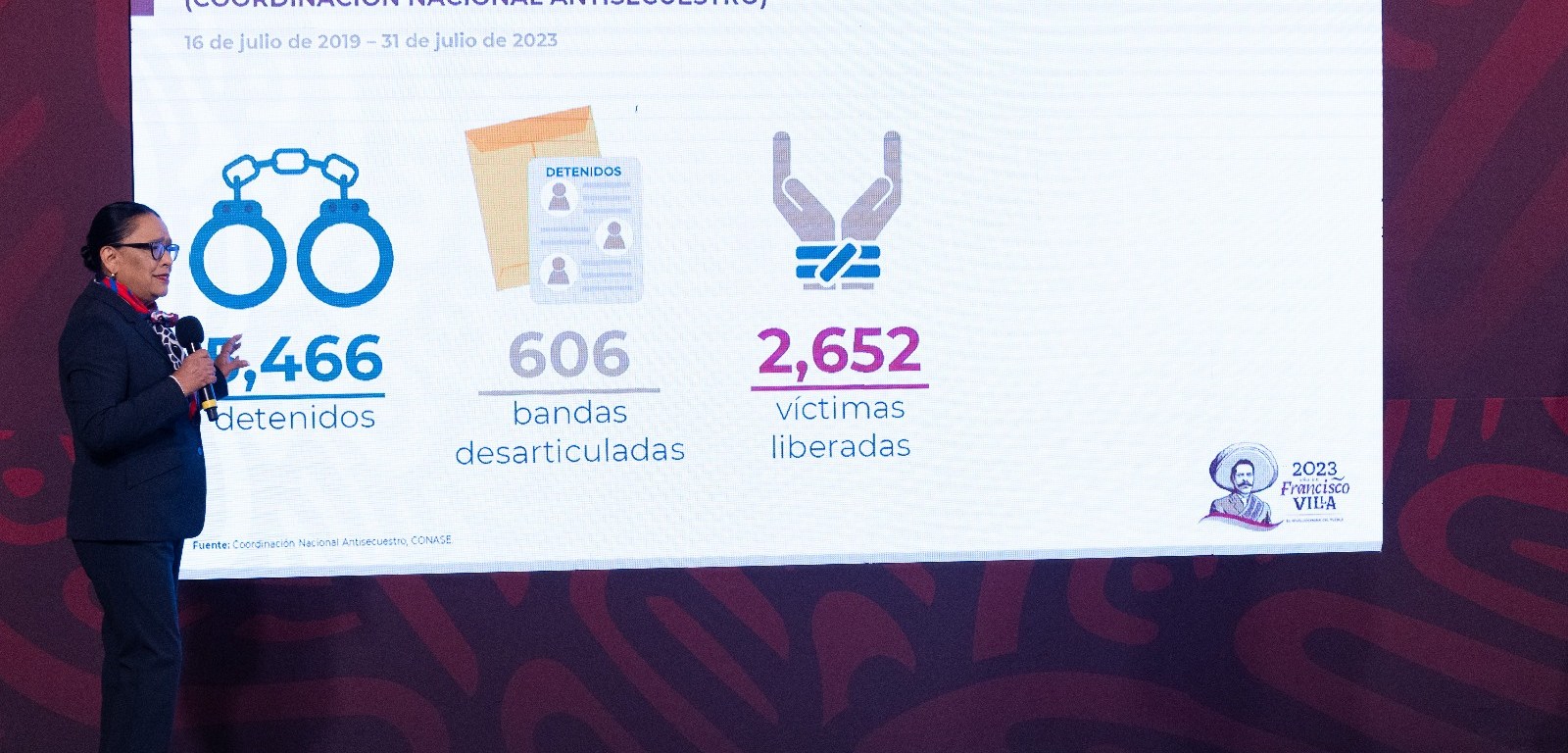 La secretaria Rodríguez resaltó que el trabajo conjunto de la Coordinación Nacional Antisecuestro (Conase) y las Unidades Especializadas en Combate al Secuestro (UECS) ha permitido la detención de 5 mil 466 personas, la desarticulación de 606 bandas y la liberación de 2 mil 652 víctimas.