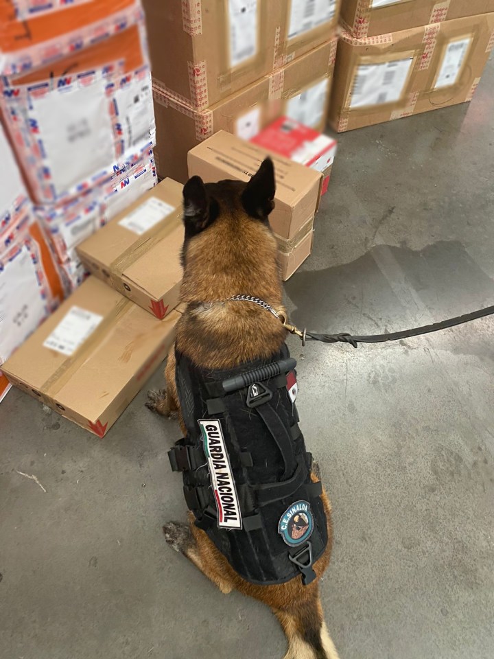Perro de la Guardia Nacional ubica marihuana en paquete de mensajería