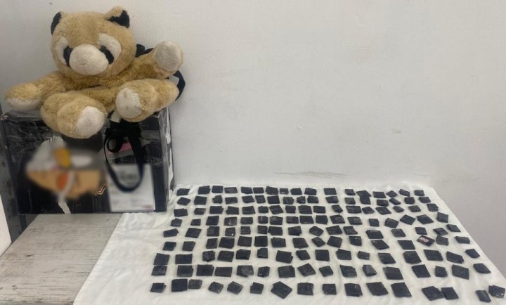 Dentro del paquete había un muñeco de peluche que ocultaba en su interior tres bolsas transparentes con aproximadamente 150 dosis de polvo blanco, con las características del narcótico conocido como cocaína.