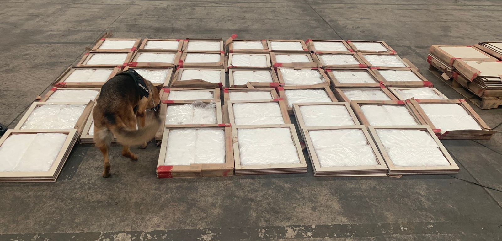 En el área de carga y descarga eligieron aleatoriamente diversos envíos, los cuales fueron olfateados por el perro de la policía militarizada, el cual se interesó por una tarima de madera que contenía 48 paquetes de loseta de cerámica para piso.