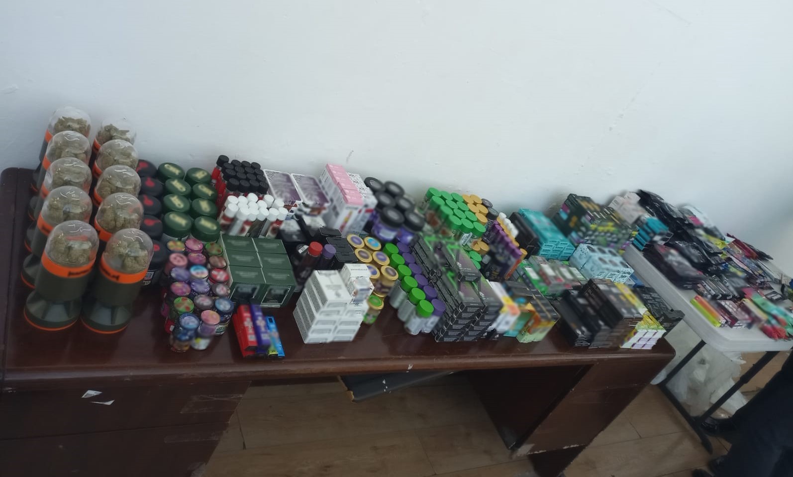 En las dos maletas se encontraron 404 cajas, 210 frascos y 144 bolsas con diversos productos comestibles como dulces y chocolates, así como cigarrillos electrónicos y morteros con cannabis.