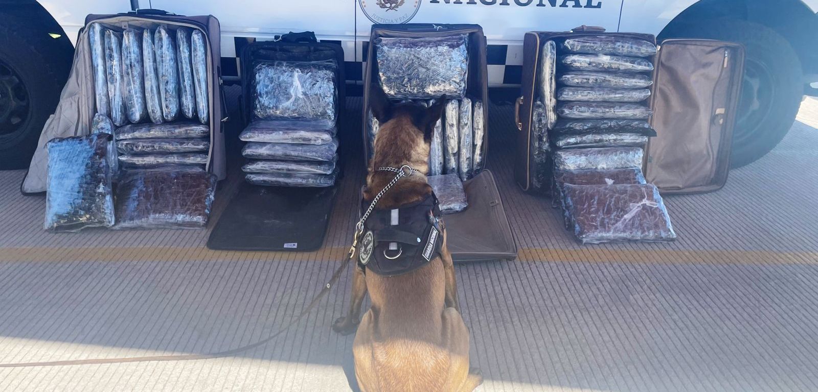 En Tlaxcala, perros de la Guardia Nacional (GN) localizaron en un autobús, cuatro maletas que contenían 46 paquetes de aparente marihuana.
