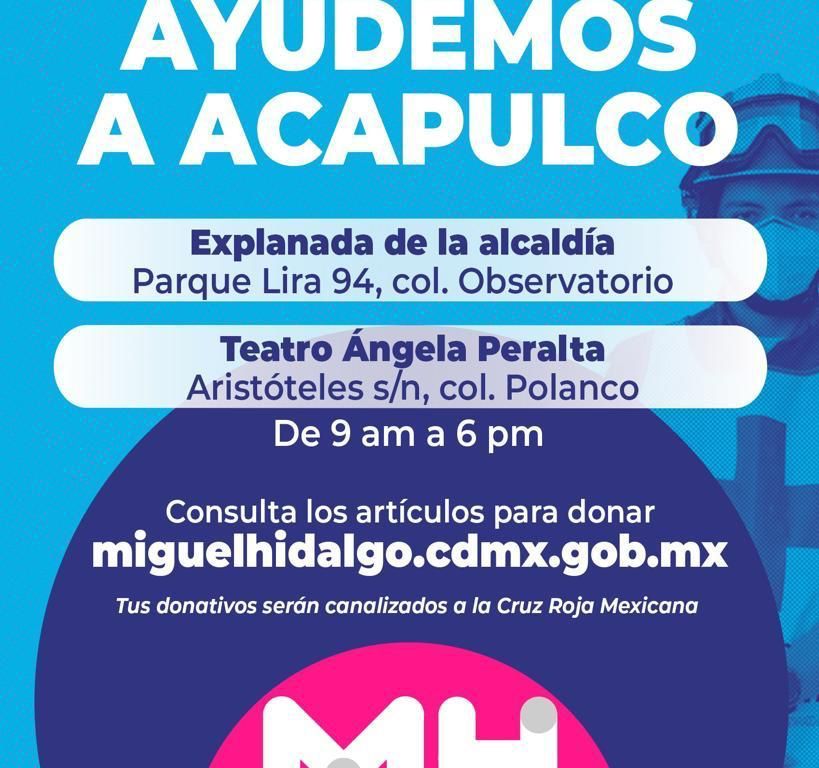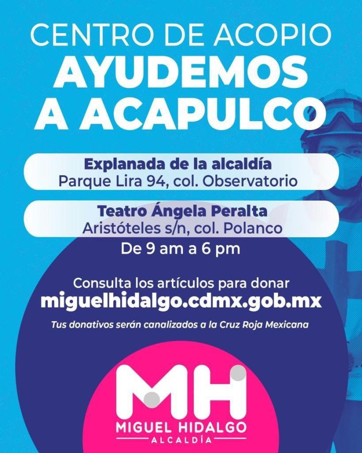 El titular de la demarcación explicó que los centros de acopio estarán ubicados en la explanada de la alcaldía, en Parque Lira No. 94 y en las instalaciones del Teatro Ángela Peralta, ubicado en el Parque Lincoln, en Polanco.
