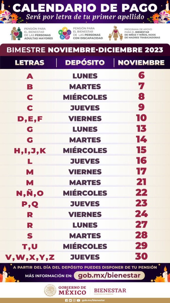 Finalmente, los apellidos que comiencen con la letra R recibirán sus pagos el 24 y 27 de noviembre. Se enfatizó que no es necesario acudir antes de la fecha programada, ya que los recursos estarán disponibles a partir de la fecha indicada en el calendario.