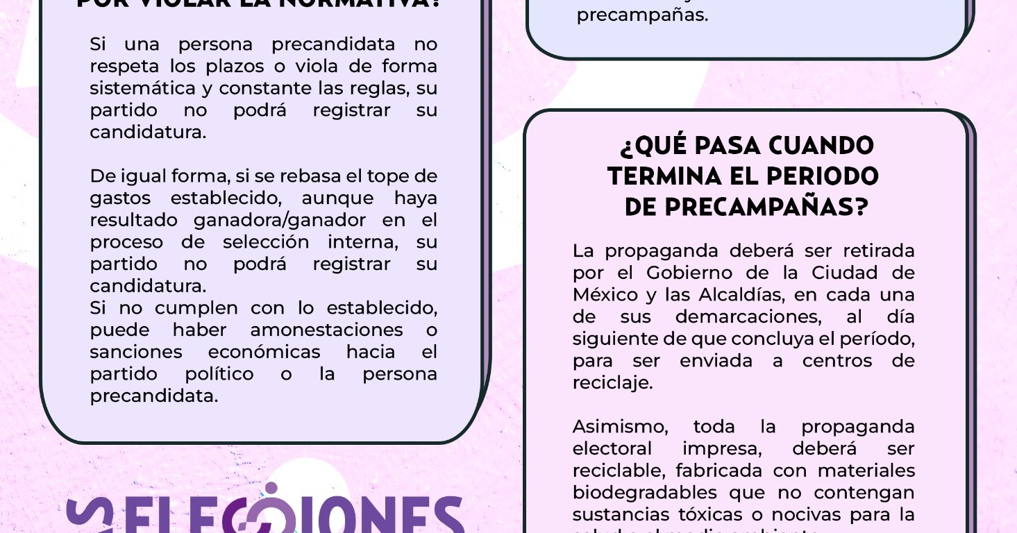 Las personas precandidatas deberán evitar actos anticipados de campaña, calumnia electoral y violencia política de género. No podrán recibir recursos no autorizados ni utilizar infraestructura pública.